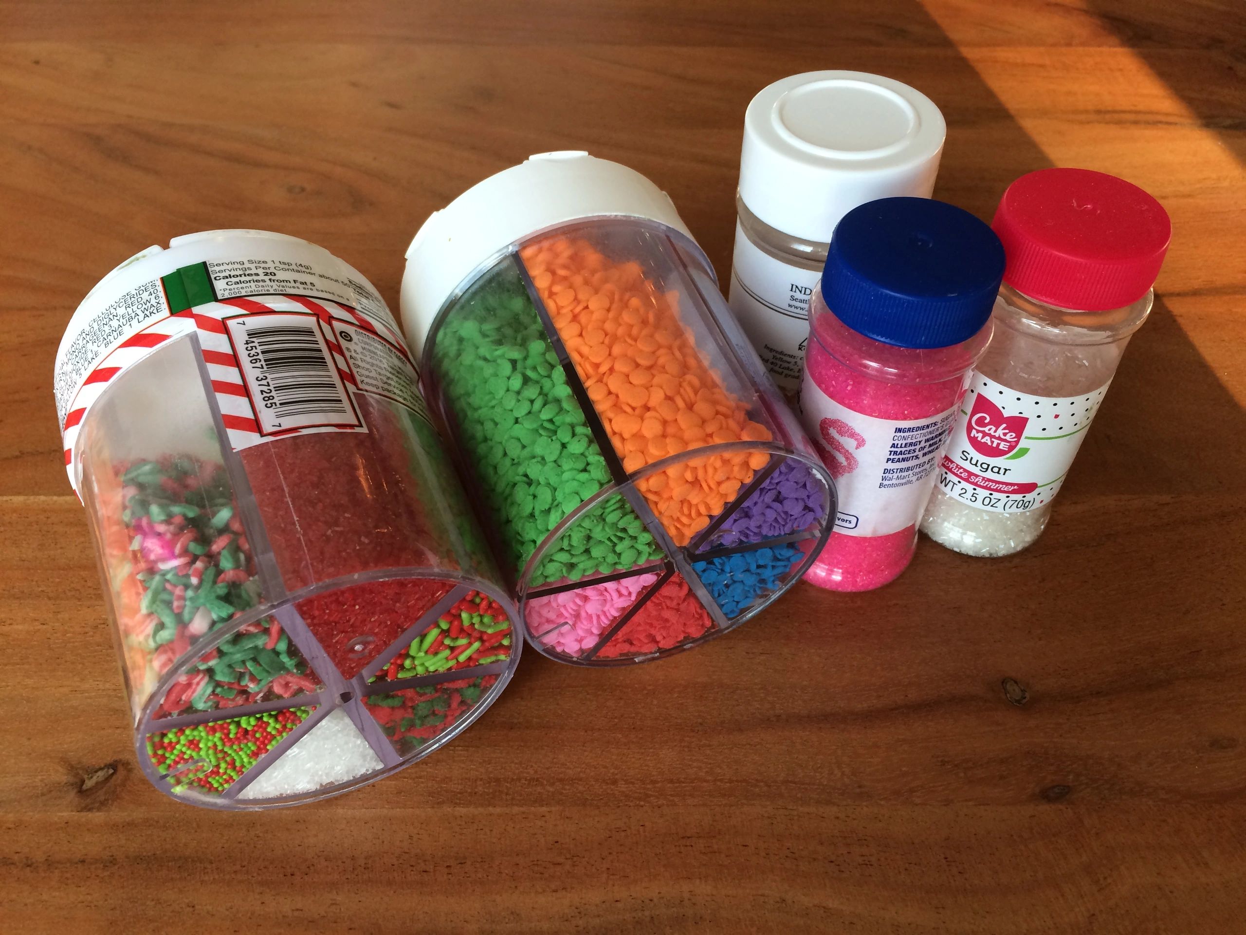 Each child has an inner artist! You can do this with the family or friends! Buy the paint holders and put in different sprinkles. As you know, little ones with full sprinkle jars tend to dump them out or have no portion control. This helps with the presentation of the fun factor, and portion control!