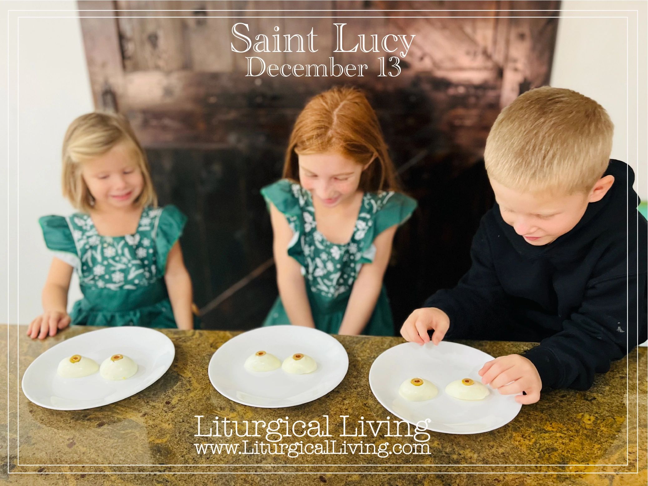 Lucy’s name means "light" or "lucid," and she is the patron saint of the blind. She is often seen with a cup or plate with eyes on them. In paintings, she is often depicted with a golden plate holding her eyes and often holds a palm branch, which is a symbol of victory over evil.