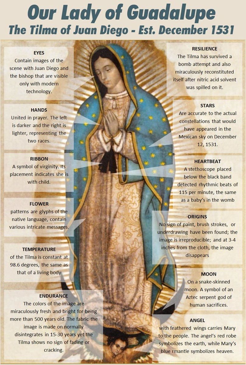 Read the story to your children! Juan Diego was an indigenous native Mexican with the name Cuauhtlatohuac, meaning “The eagle who speaks”. In 1531 when on his way to morning Mass, the Blessed Mother appeared to him on Tepeyac Hill, the outskirts of what is now Mexico City, and asked that a shrine be built in her name. Juan Diego told the bishop about this. The Bishop asked for a sign to prove that the apparition was true. The Blessed Mother told him to climb the hill and to pick the roses in the winter. He gathered flowers, and Our Lady carefully placed them in his mantle and told him to take them to the Bishop as "proof". When he opened his tilma (the article of clothing he wore as shown in the picture), the flowers fell on the ground and the flowers had created a miraculous image of the Blessed Mother that is now known as Our Lady of Guadeloupe. The image is preserved in the Basilica of Our Lady of Guadalupe, Mexico. Because of the miraculous image our Lady and what it depicted, 9 MILLION people converted to Catholicism! Wow!